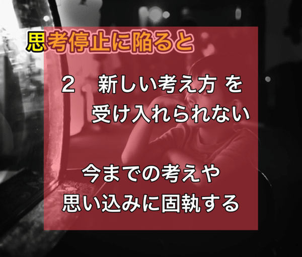 思考停止では、今までの考えや思い込みに固執し、新しいアイデアや考え方を受け入れることが難しくなります。